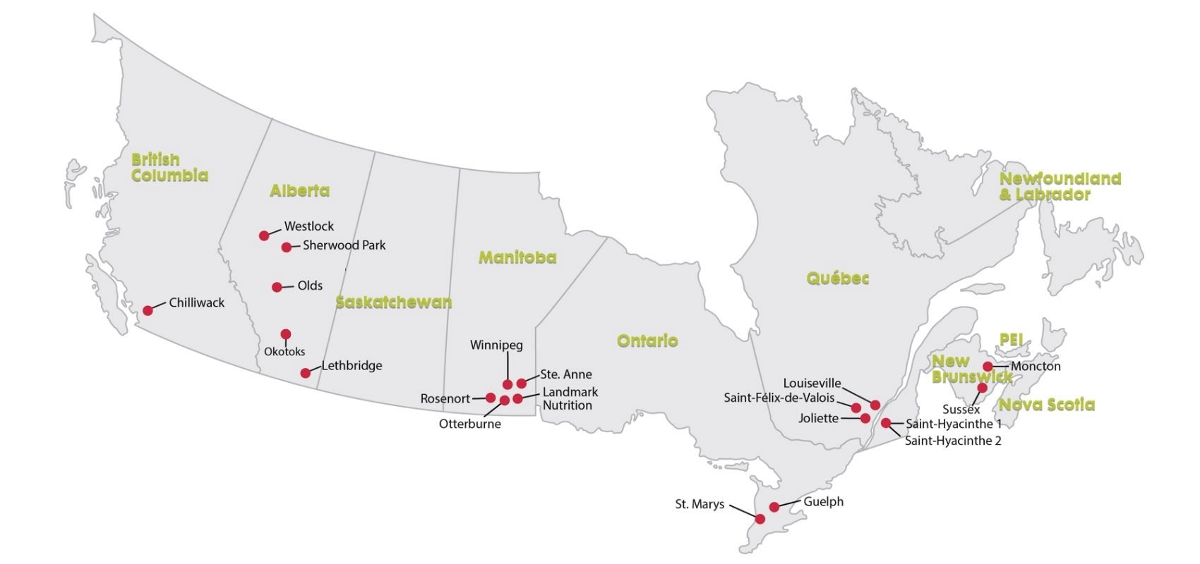 Over the course of the past 80+ years, the business has grown from having Shur-Gain feed dealers in Eastern Canada and building Landmark and Hi-Pro Feeds facilities in Manitoba and Alberta respectively, to now having facilities and operations located across Canada – from British Columbia to New Brunswick – operating as Trouw Nutrition Canada.