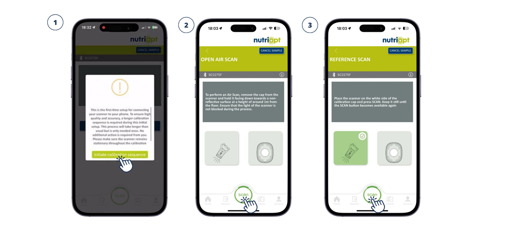 The application will notify you when calibration is needed, which is always before scanning a sample. When connecting a scanner to a mobile phone for the first time or after a new app update, a longer initial calibration sequence is required. To begin, press "Initiate Calibration Sequence" (1). Once this initial calibration is completed, the scanner will be memorized. For subsequent scans, only the shorter Open Air Scan and Calibration Cap Scan (with a white/yellow background) are needed.