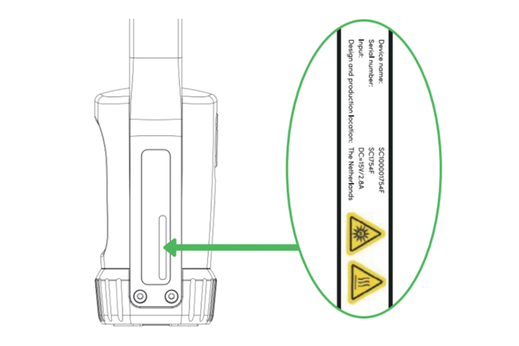 Start by switching on your handheld scanner and locating the device's name. The name of your scanner is on the back side of the handle. The device name should follow this scheme: ‘SCxxxxxF’. For example “SC01234F”.