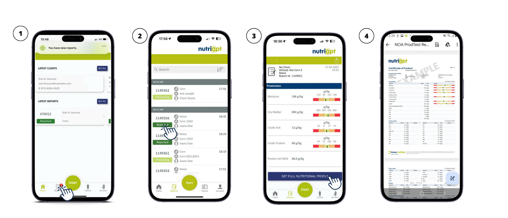 - Once you click your report, the proximate analysis of your sample will be available (3). If you want, you can also receive a 'Full Nutritional Profile' of your sample (3).