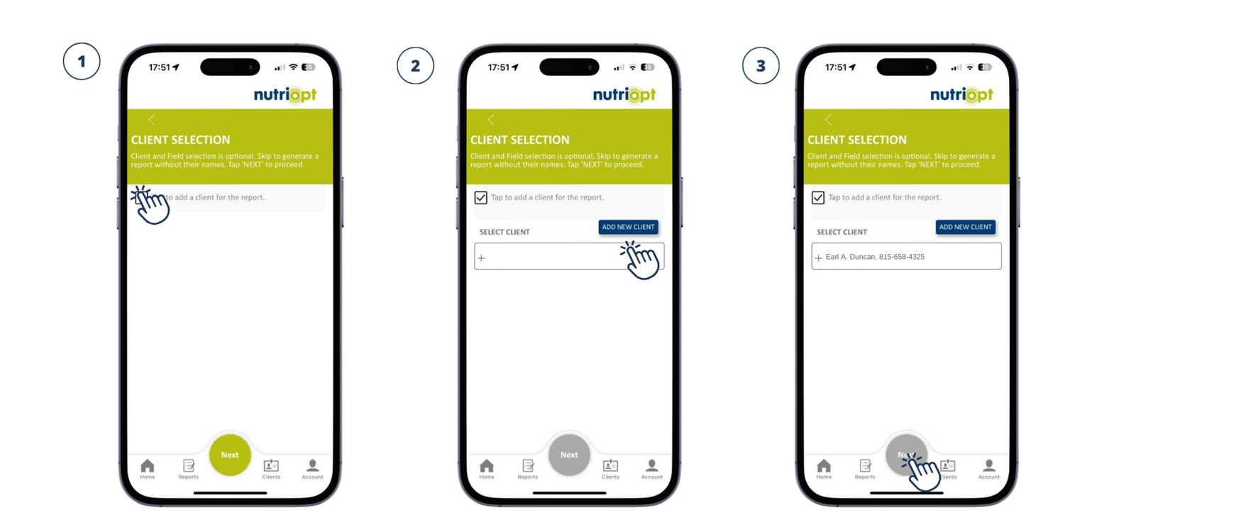 On the 'CLIENT SELECTION' page, you have the option to either select an existing client or add a new one (3). Please note that client selection is not mandatory, so you can also choose to continue by clicking the 'NEXT' button.