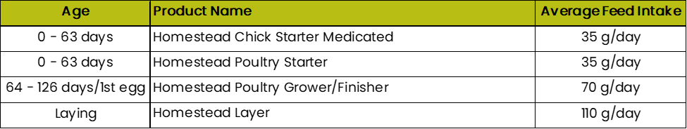 Feed as the sole ration to laying hens in production as per the table below. Provide clean, fresh drinking water at all times.