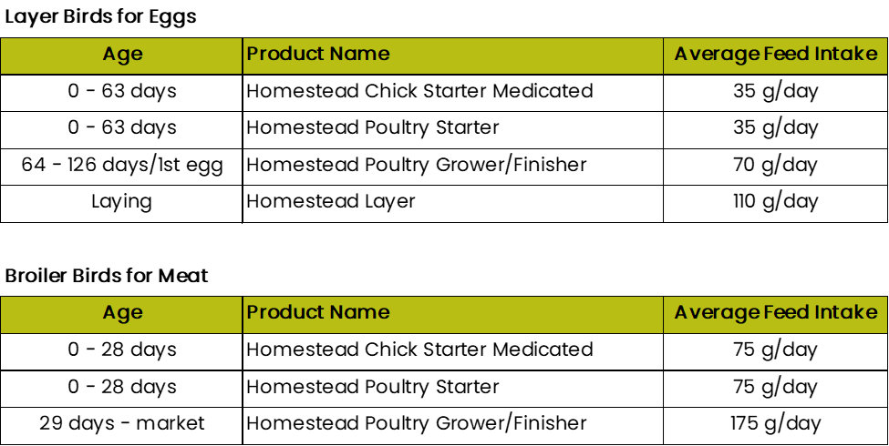 Feed as the sole ration to replacement layer chickens or broiler chickens as per the tables below. Provide clean, fresh drinking water at all times.